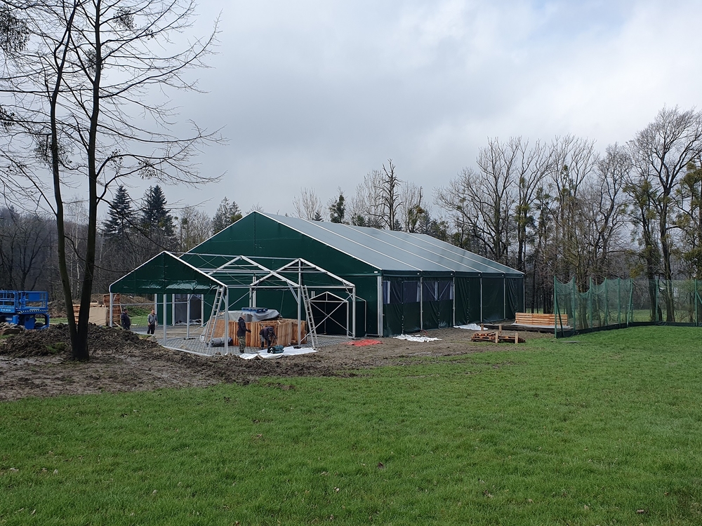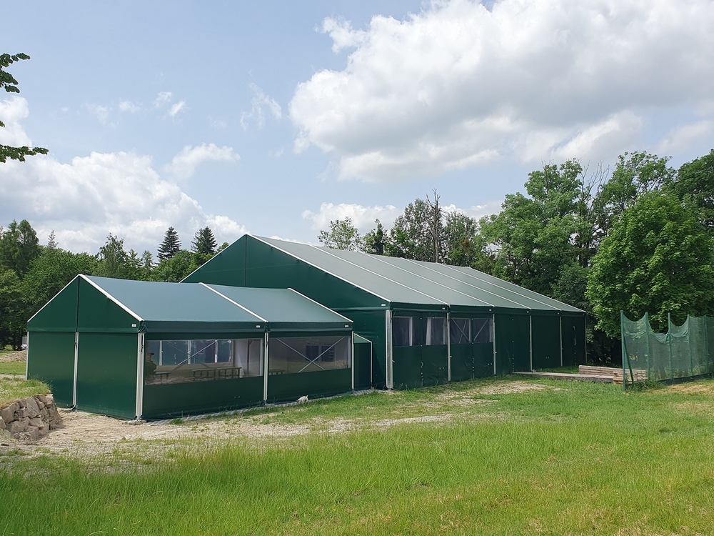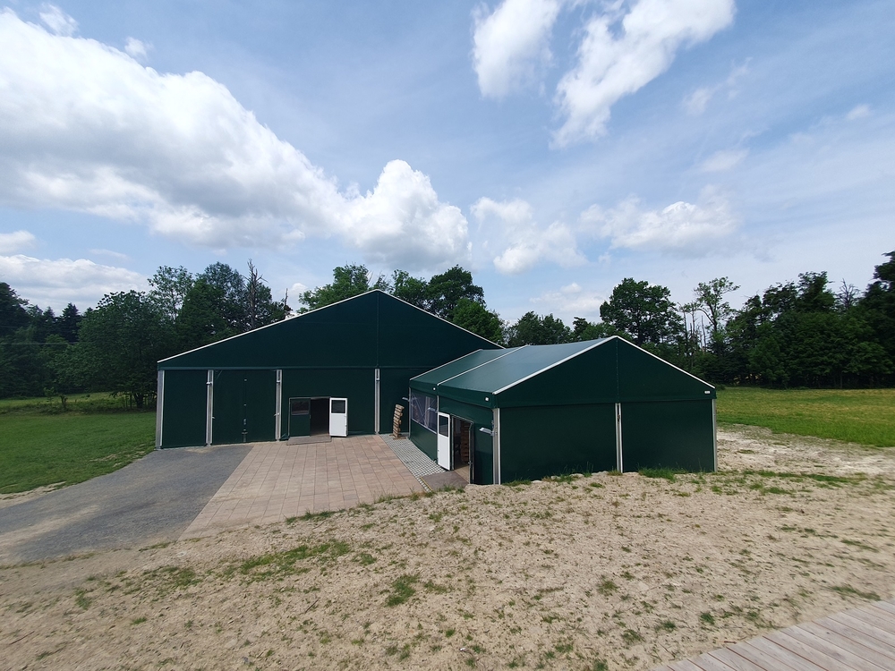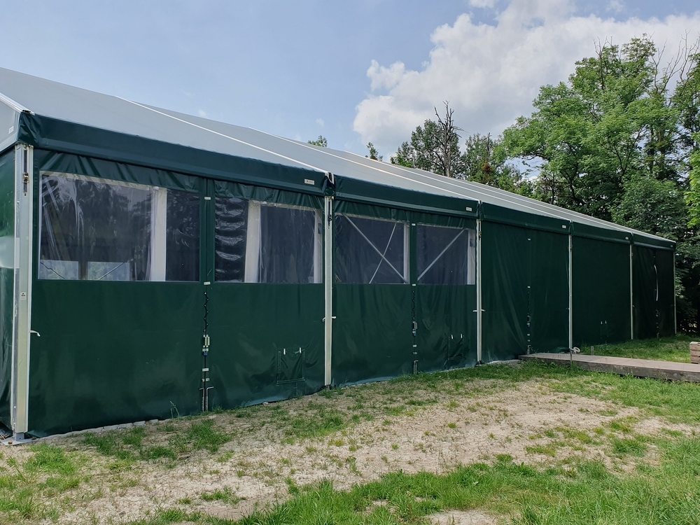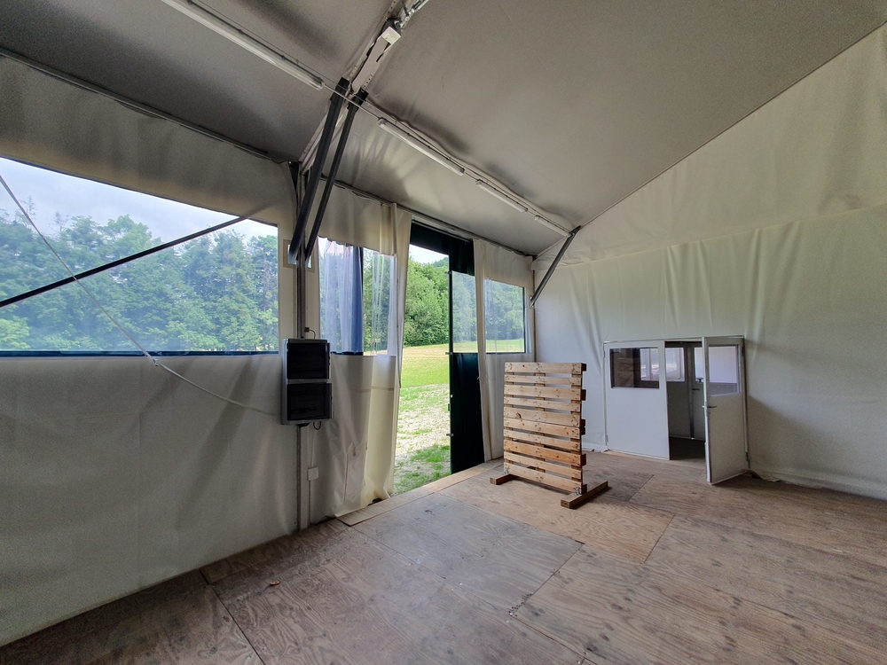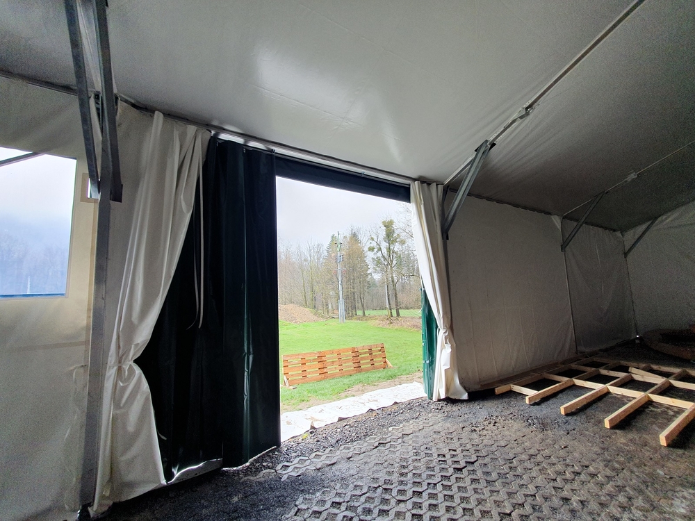 Special tent measuring 20 x 25 m with a wall height of 4 m and an attached catering area measuring 8 x 10 m. Both tents have a reinforced structure with a double-layer tarpaulin insulation shell and a natural green color design. Both structures are equipped with double doors, a connecting tunnel, foil windows, roll-up side walls, and an inner shell in an unobtrusive gray and white color. They are also equipped with wooden flooring and indirect LTO heating. For a very reasonable investment, a fully functional year-round social meeting place for people of good will has been created.
