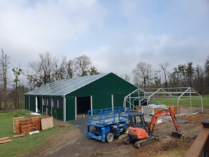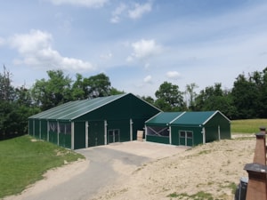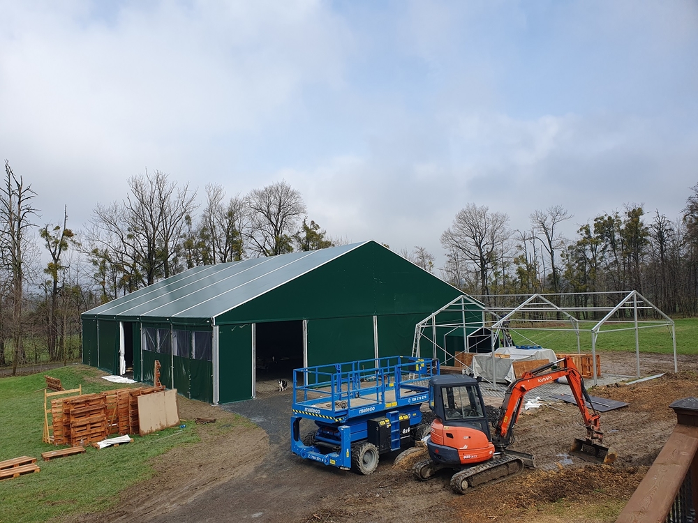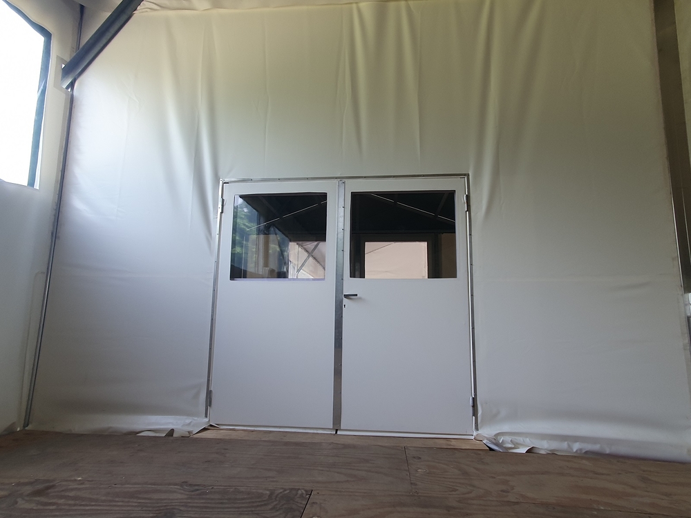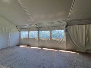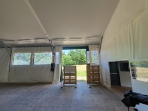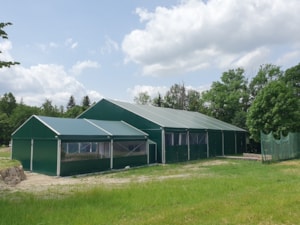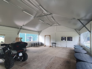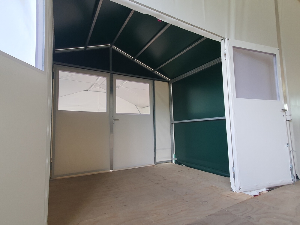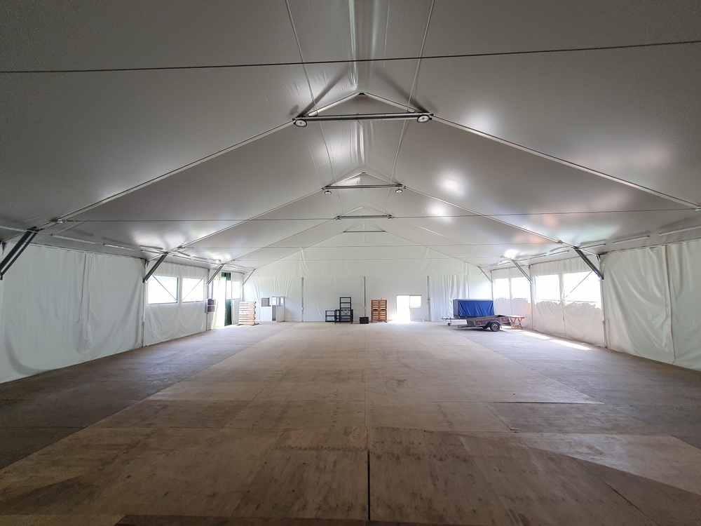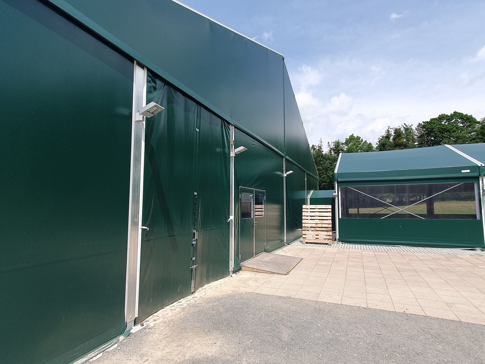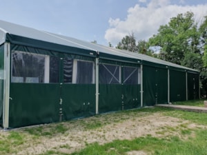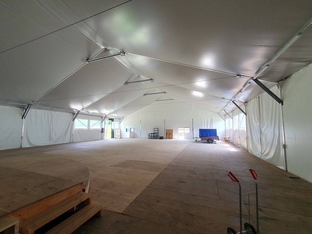 Special tent measuring 20 x 25 m with a wall height of 4 m and an attached catering area measuring 8 x 10 m. Both tents have a reinforced structure with a double-layer tarpaulin insulation shell and a natural green color design. Both structures are equipped with double doors, a connecting tunnel, foil windows, roll-up side walls, and an inner shell in an unobtrusive gray and white color. They are also equipped with wooden flooring and indirect LTO heating. For a very reasonable investment, a fully functional year-round social meeting place for people of good will has been created.