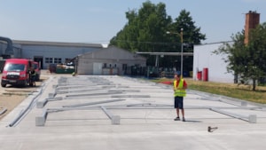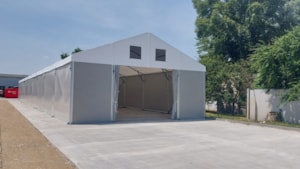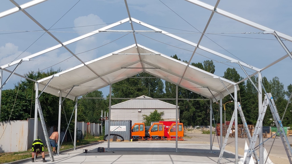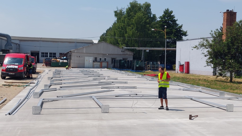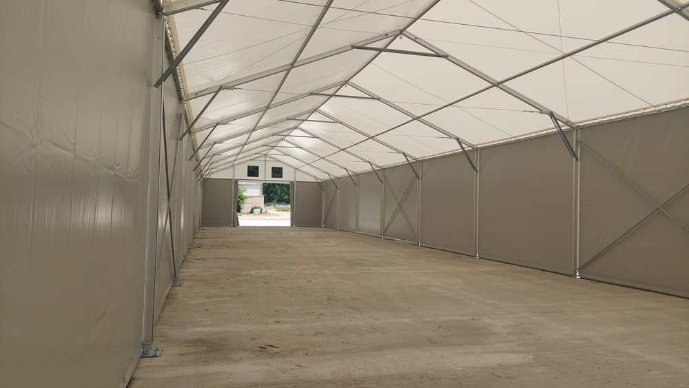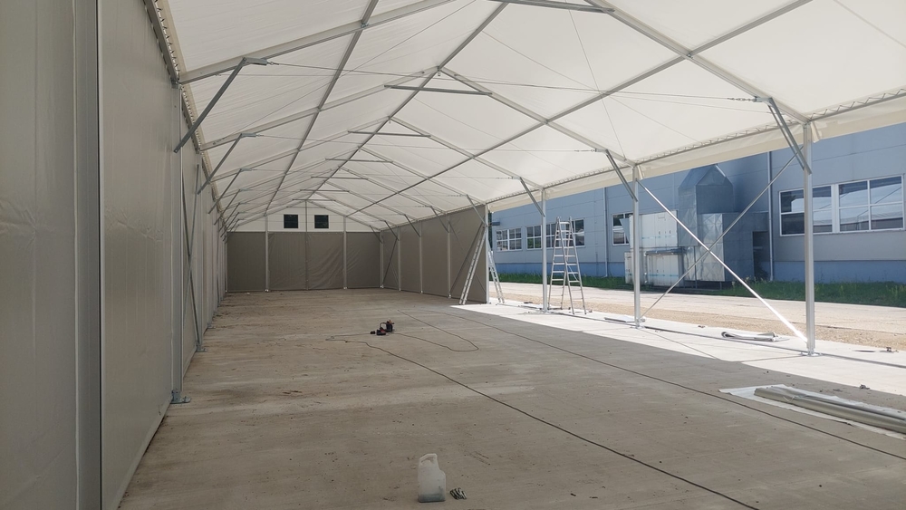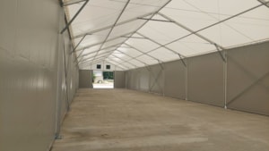 The most commonly supplied span is 10 m, here with a length of 45 m and a standard wall height of 4 m. Internal struts and tie rods ensure light snow resistance. Front central entrance with a roll-up tarpaulin. The hall is mounted on a concrete foundation slab. Wall cladding in a light gray shade. Manufactured for Fortaco from Holíč, Slovakia. Construction completed in two days.