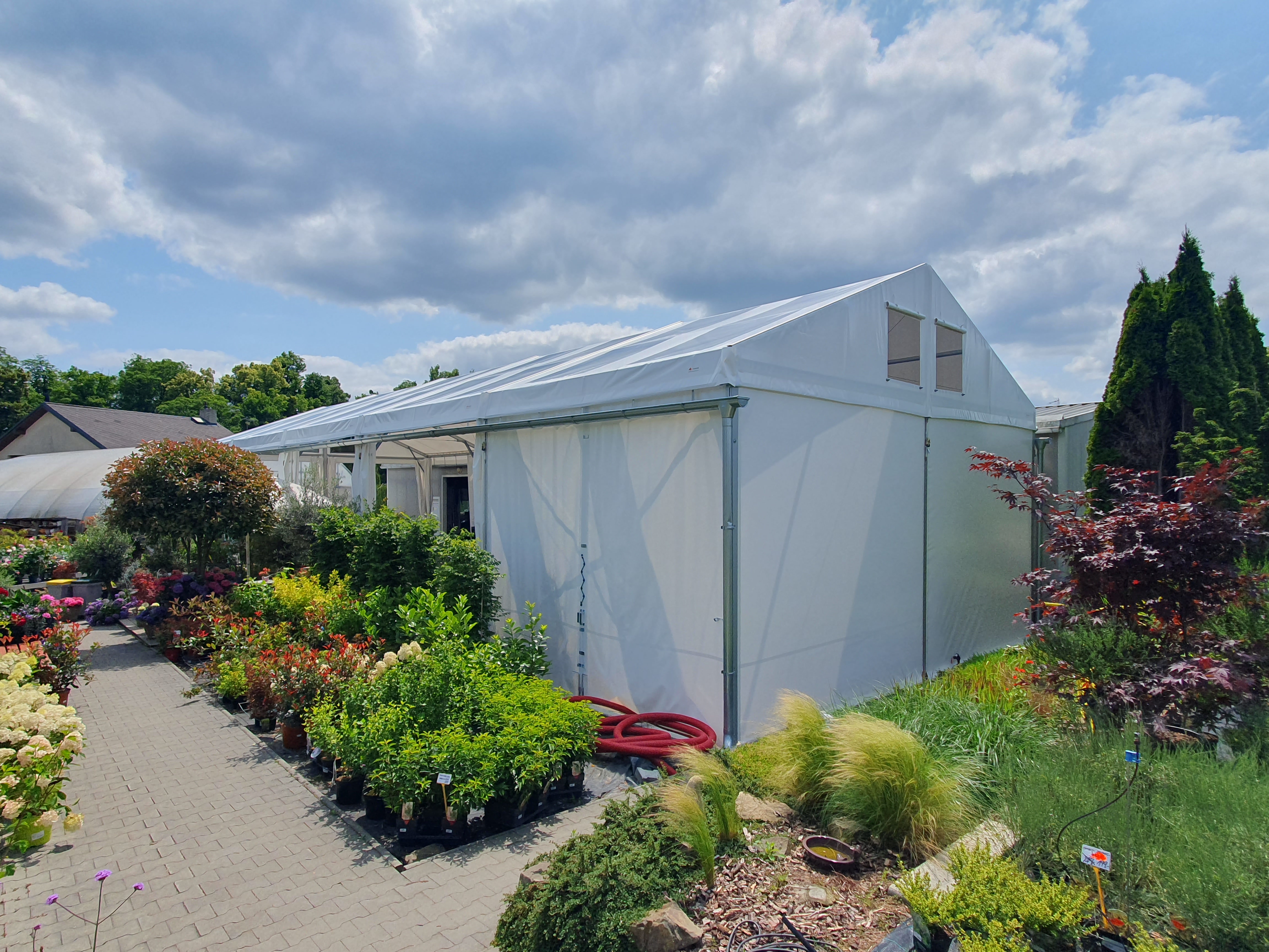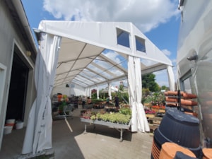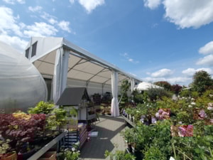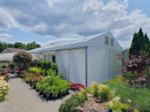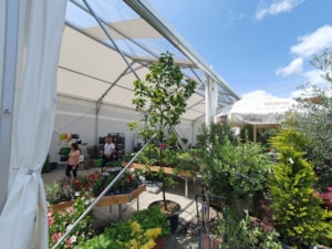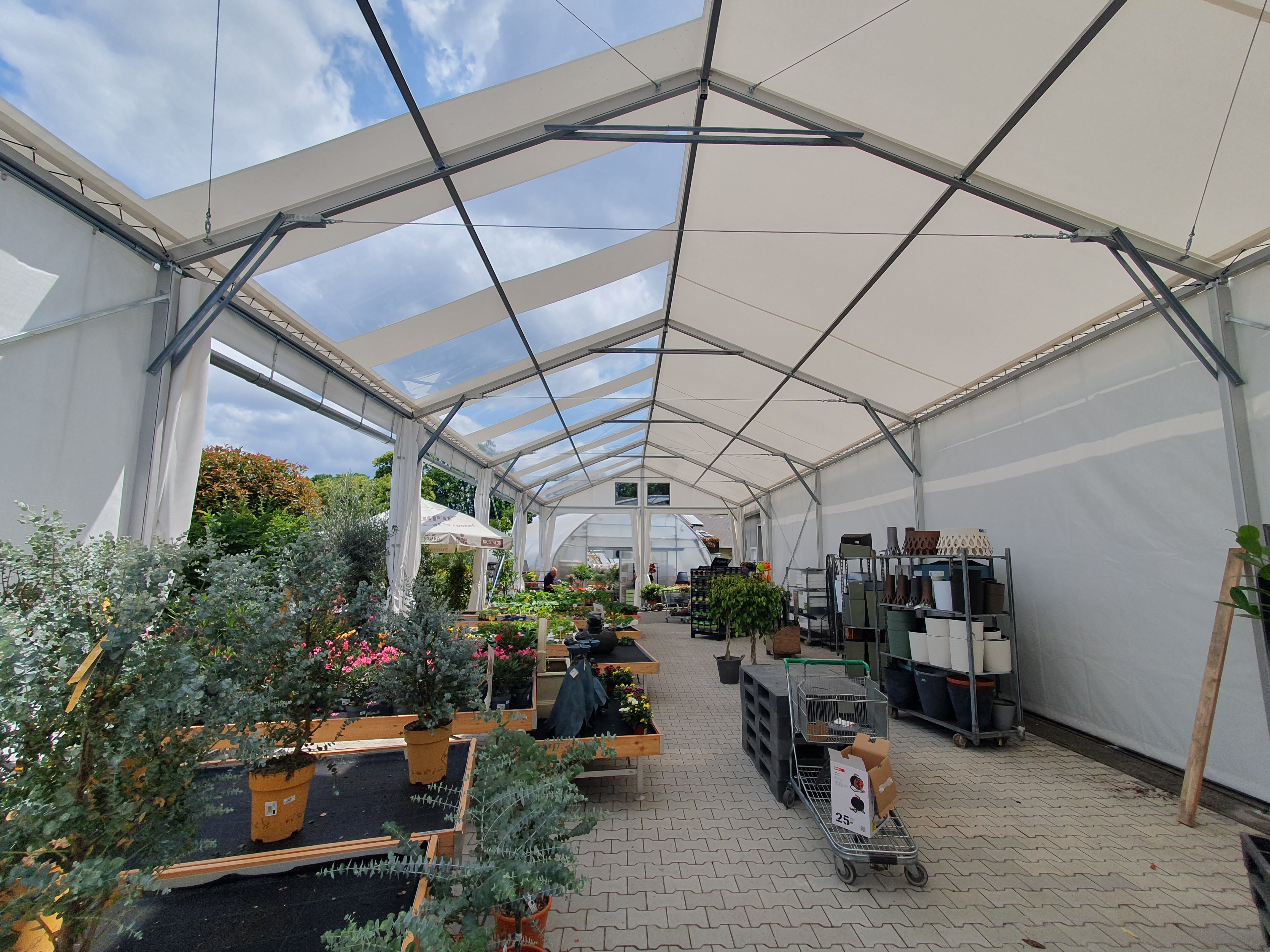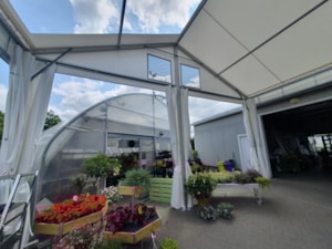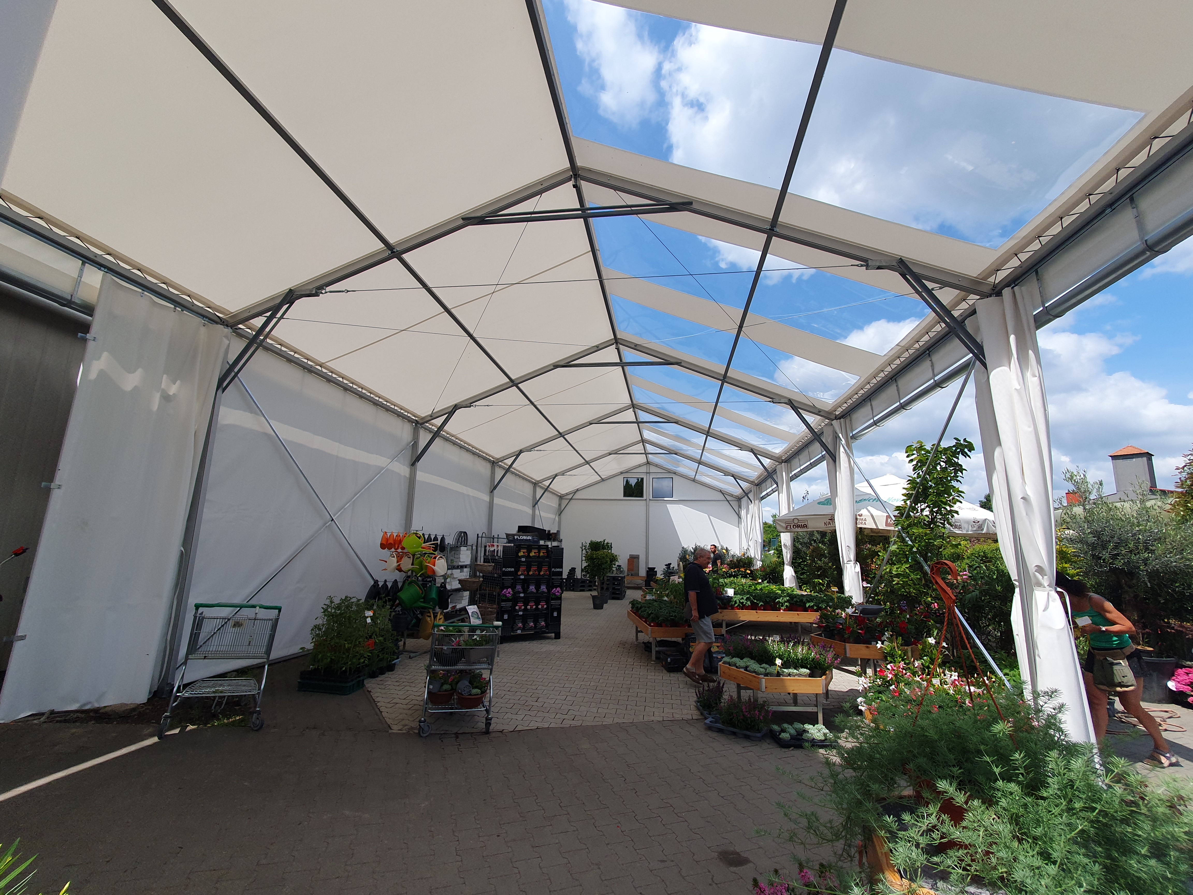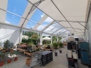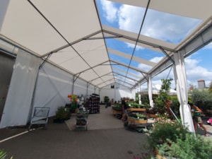 Flower shop and garden center in a tent hall. That's possible too. Specially modified tarpaulin cladding makes it possible.