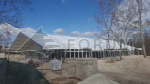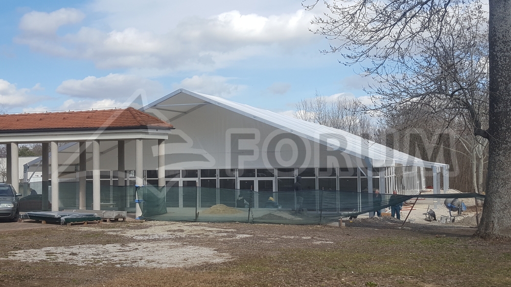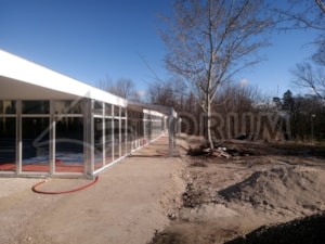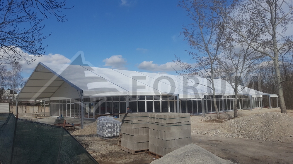 We designed and built a large social tent with lots of new features for Sun Invent. Dimensions 20x45m, side wall 3m, heavy-duty wooden floor, front gable roof covering the terrace, integrated entrance shelters, glass walls and doors, trapezoidal sheet metal cladding, an internal partition for the catering preparation area, glass walls without wind braces, and much more can be found in this structure at the castle in Jaslovské Bohunice, Slovakia.