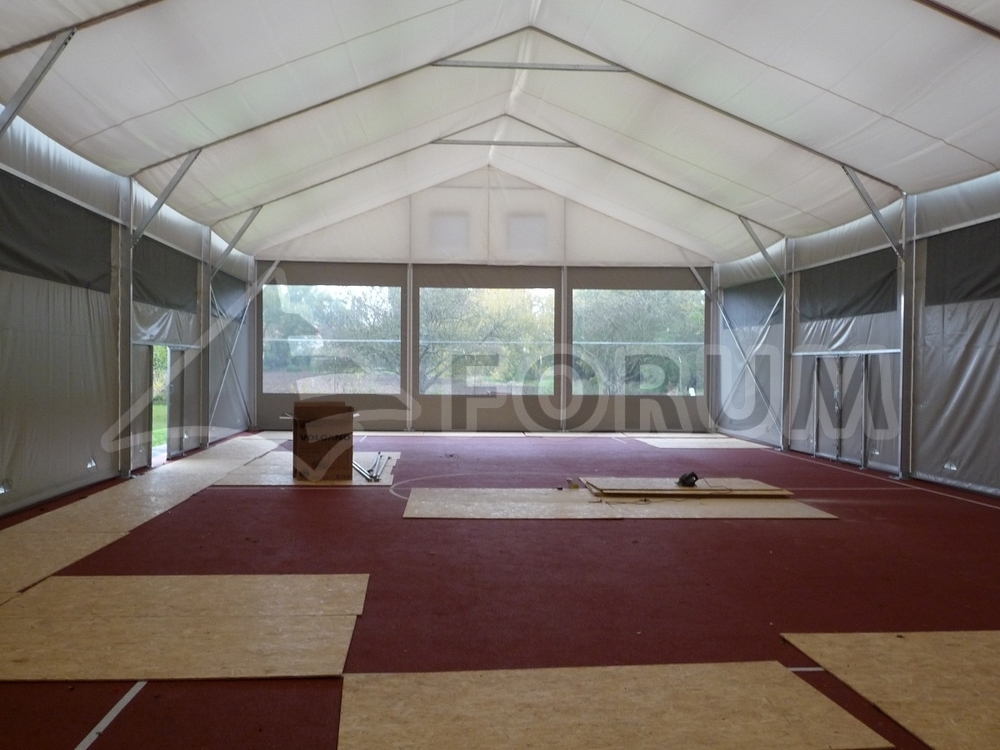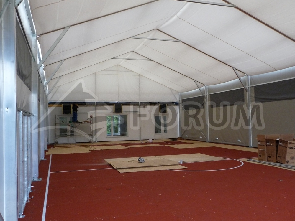 This special hall was manufactured for the Czech British International School. Floor plan dimensions 12x25m, increased side wall height 4.6m, connection to the existing building with a "dry foot" passage. The hall is also equipped with a double roof cladding, an automatic ventilation system, doorways, large foil windows and separate heating. The hall can thus operate all year round with the possibility of internal heat regulation. The hall is built on a concrete foundation slab with a hermetically sealed connection to the upper structure.