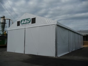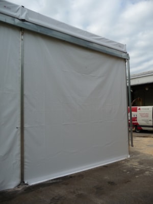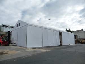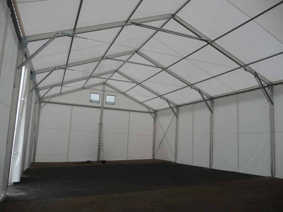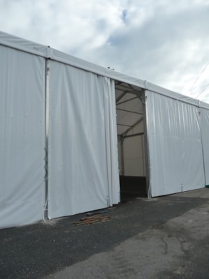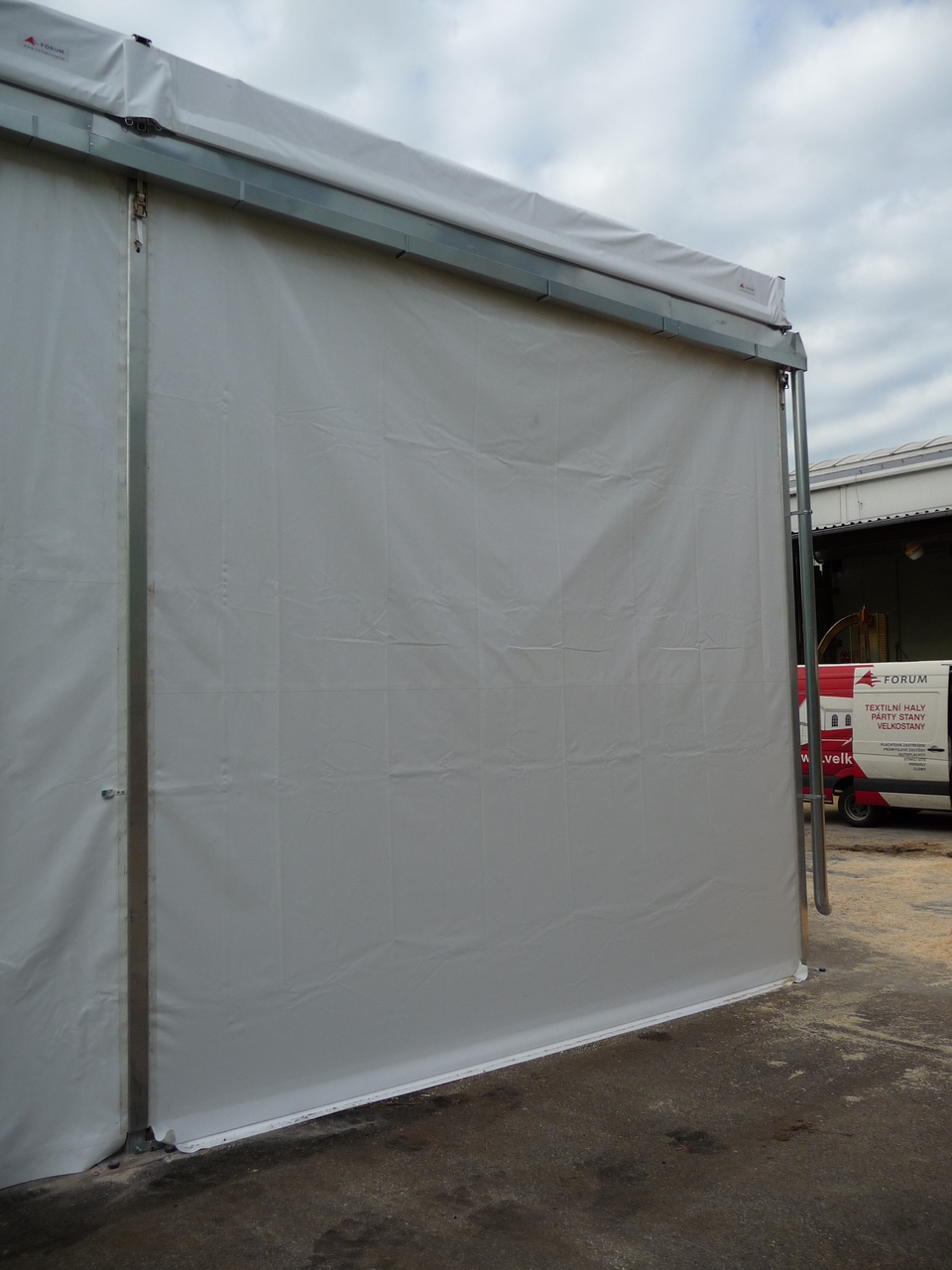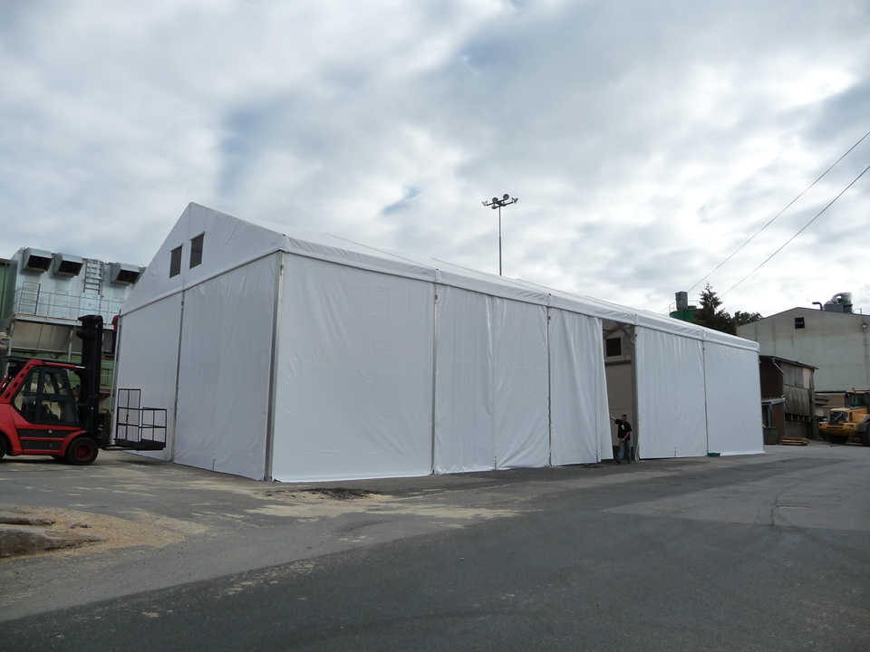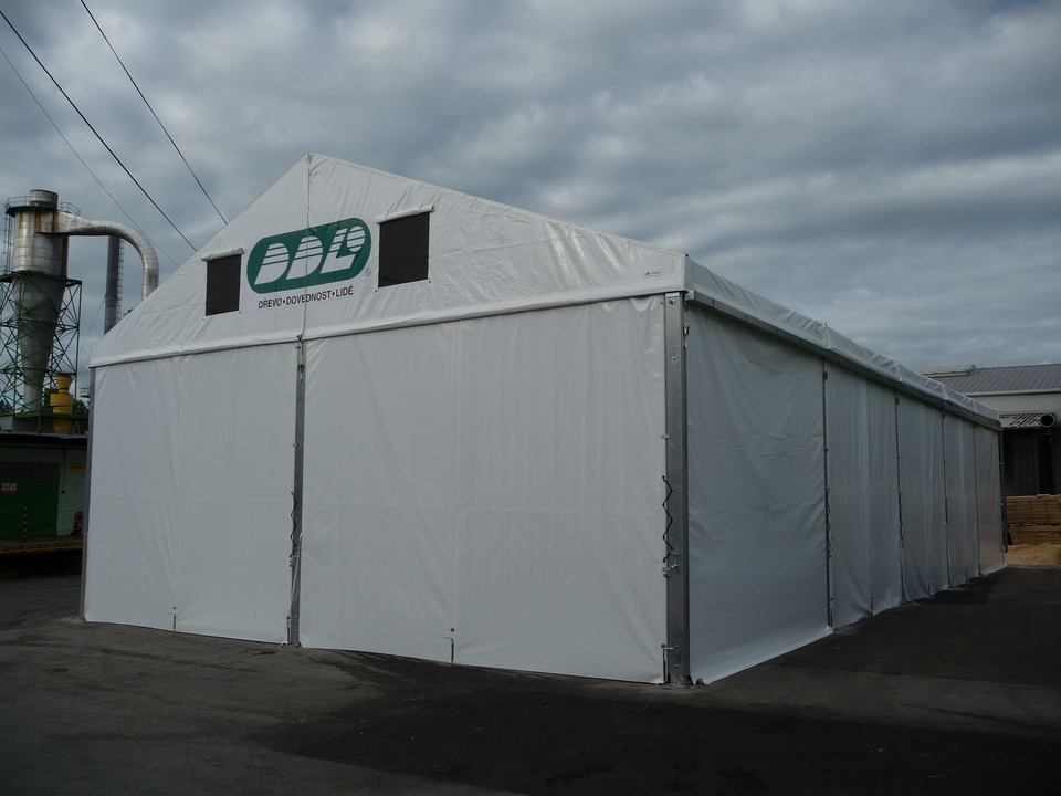 Custom-made tent hall for the Lukavec Wood Processing Cooperative, floor plan dimensions 12 x 25 m with raised side walls with a height difference of 4.5–6 m. Robust Al profile used to increase snow load capacity. Adapted to the sloping construction area with a height difference of up to 1.5 m. Side wall sliding tarpaulin screens allow access from all sides, and gutter downspouts drain rainwater from the top of the sloping building area. Automatic ventilation in the gables. The hall is used for storing large-format wooden semi-finished products.