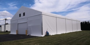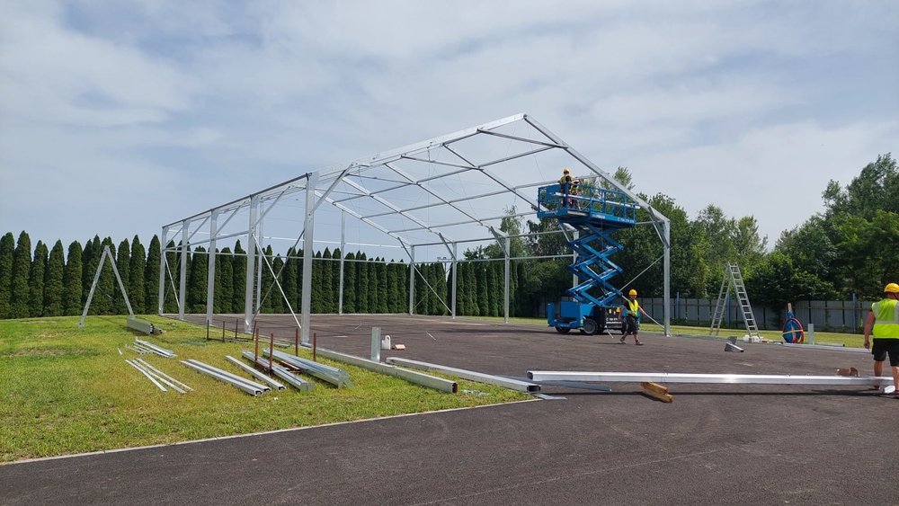 The hall is equipped with a 3x5m front center sliding door, two emergency doors with panic handles, and an extended lower canvas perimeter hem to drain rainwater from the building foundations. Complete custom production according to the client's requirements. Get a quote for your own special order!